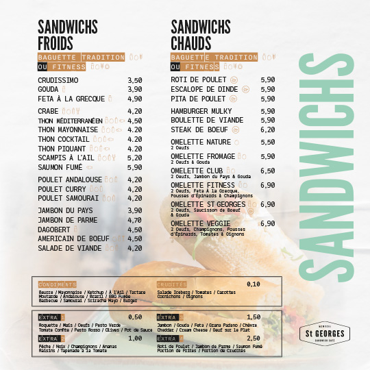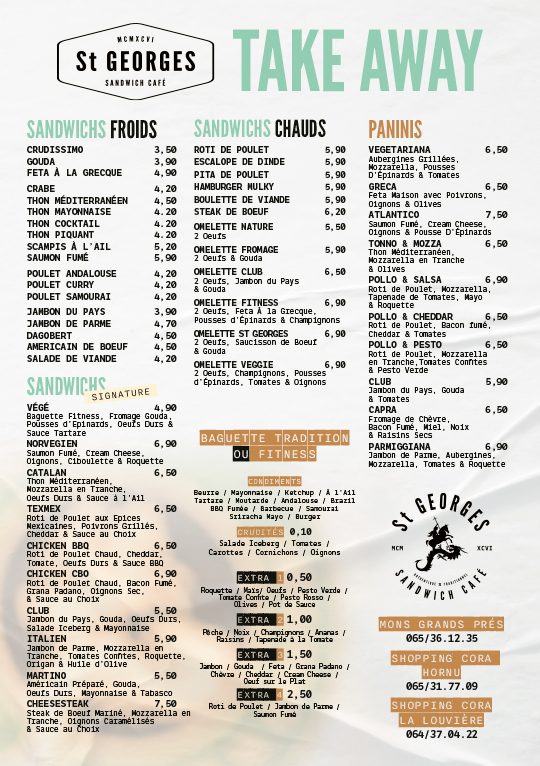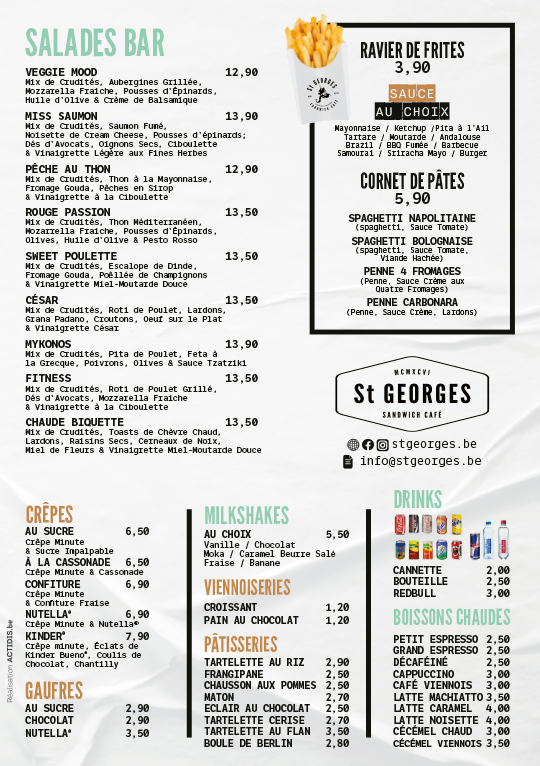 Que vous soyez amateur de sandwichs classiques, de recettes signatures, de burgers gourmets, de plats chauds ou d’un tea-room sucré, St Georges vous propose une carte variée qui évolue au fil du temps, toujours avec la même exigence de qualité. Parce qu’un bon repas est avant tout un moment de plaisir, nous avons imaginé un lieu qui allie design soigné et ambiance accueillante, pour que chaque visite devienne une expérience à part entière. Chez St Georges, on ne vient pas seulement manger… on vient vivre un moment.